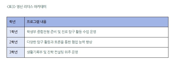 영신여고는 1~3학년 과정 중 학생부 종합전형 지원을 준비하는 학생들을 대상으로 한 학기당 각 20명씩 총 60명을 선발하여 생활기록부와 진학 컨설팅, 학생이 지원하려는 계열 및 학과와 관련한 발표 및 보고서, 교내 공모전과 학술제를 함께 준비하면서 개인별 맞춤형 입시 전략을 구성하는 방과후 프로그램을 운영하고 있다.