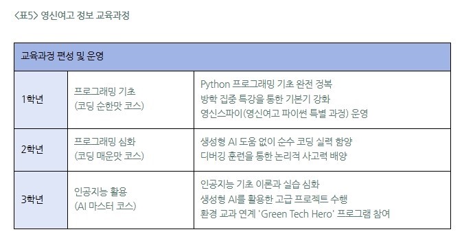 단순한 기술 습득을 넘어 AI 시대를 주도할 창의적이고 따뜻한 여성리더 양성을 목표로 한다. 영신여고는 여성 IT 인재 양성의 선두주자로 2025년 인공지능‧정보교육 중심학교에 선정되어 있고, 한층 더 전문화된 커리큘럼을 운영하며 미래 여성 IT 리더 양성에 앞장서고 있다. AI 해커톤 캠프를 정기적으로 개최하여 학생들의 실전 프로젝트 역량을 키우고 있다. 학생들이 주도적으로 기획하고 개발한 작품들은 높은 완성도를 보여주며, '플라스틱 쓰레기 재활용 가이드'와 같이 실생활 문제를 해결하는 실용적인 프로젝트들이 우수 사례로 평가받고 있다.