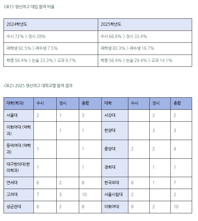 지난해에 비해 서울대 합격자를 1명 더 배출했고, 메디컬학과에 진학한 학생의 수도 늘어났다. 특히 특목고와 자사고 학생들이 주로 지원하는 전형으로 알려진 고려대학교 계열적합형에 2명의 합격자를 동시에 배출했다는 점에서 영신여고의 입시 경쟁력을 여실히 보여주었다. 현재 영신여고에서 이루어지고 있는 교육활동 및 프로그램, 다양한 행사들이 학생들의 지적 호기심을 이끌어내고, 자기계발을 통한 성장과정을 충분히 보여주고 있다. 3학년 부장 전찬진 교사는 모든 교사가 합심하여 생활기록부의 질적 향상을 위해 노력하고 있다고 강조한다.