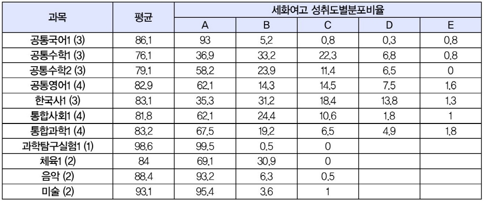 여고: 세화여고의 평균 높고, 성취도 A의 비율이 62.1%