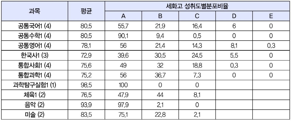 <2025학년도 세화고 1학년 1학기 교과별 성취도> (단위: 점수, %)