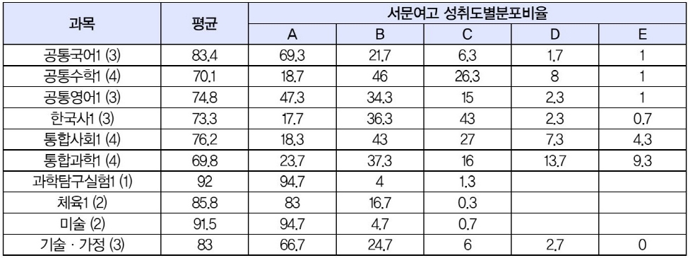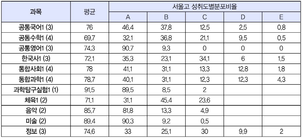 <2025학년도 서울고 1학년 1학기 교과별 성취도> (단위: 점수, %)