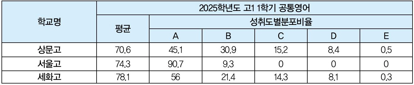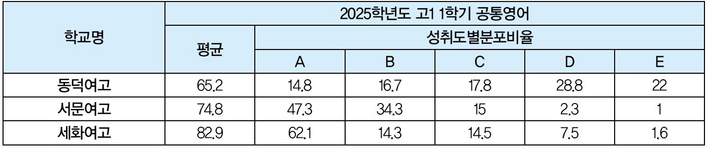 서초 여고 3개 학교의 공통영어 과목 평균과 성취도별 분포를 비교해보면 세화여고의 평균이 82.9점으로 상당히 높았으며, 동덕여고의 평균은 65.2점으로 낮았다. 두 학교의 평균 차이는 17.7점이나 되었다. A~E 성취도별 분포 비율을 보면, 세화여고는 A의 비율이 62.1%로 높았으며, 서문여고는 A+B의 비율이 높고, 동덕여고는 D와 E의 비율이 높았다.