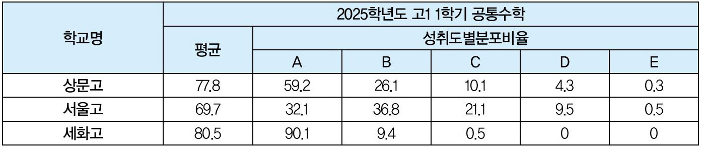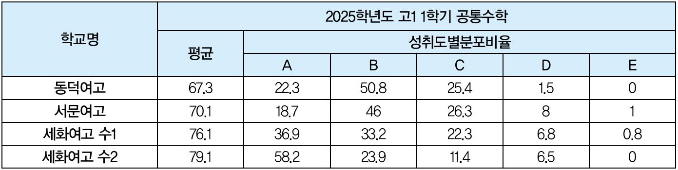 서초 여고 3개 학교의 공통수학 과목 평균과 성취도별 분포를 비교해보면 세화여고의 평균이 공통수학1은 76.1 공통수학2는 79.1로 높았으며, 동덕여고의 평균은 67.3으로 낮은 현이었다. A~E 성취도별 분포 비율을 보면, 세화여고는 A와 B의 비율이 높았으며, 동덕여고와 서문여고는 A보다 B의 비율이 가장 높고 C의 비율도 높은 편이다.
