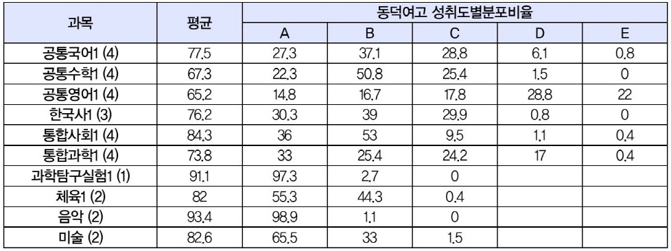 <2025학년도 동덕여고 1학년 1학기 교과별 성취도> (단위: 점수, %)