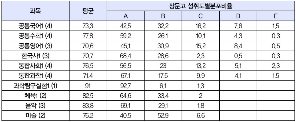<2025학년도 상문고 1학년 1학기 교과별 성취도> (단위: 점수, %)