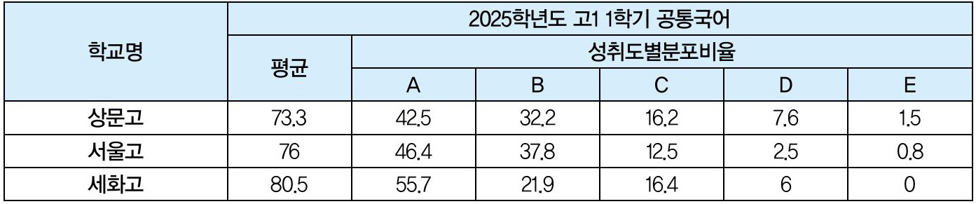서초 남고 3개 학교의 공통국어 과목 평균과 성취도별 분포를 비교해보면 세화고의 평균이 80.5점으로 가장 높고, 상문고의 평균이 73.3점으로 낮다. A~E 성취도별 분포 비율을 보면, 세 학교 모두 A와 B 구간의 비율이 높고 D와 E 구간의 비율은 미미했다.
