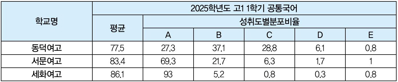 서초 여고 3개 학교의 공통국어 과목 평균과 성취도별 분포를 비교해보면 세화여고의 평균이 86.7점으로 상당히 높았고, 동덕여고의 평균이 77.5점으로 상대적으로 낮았다. A~E 성취도별 분포 비율을 보면, 세화여고의 A 비율은 93%로 압도적으로 높았고 C~E 구간의 비율은 극히 낮았다. 서문여고는 A의 비율이 69.3%로 상당히 높았고, 동덕여고의 경우 B와 C 구간의 비율이 높았다.