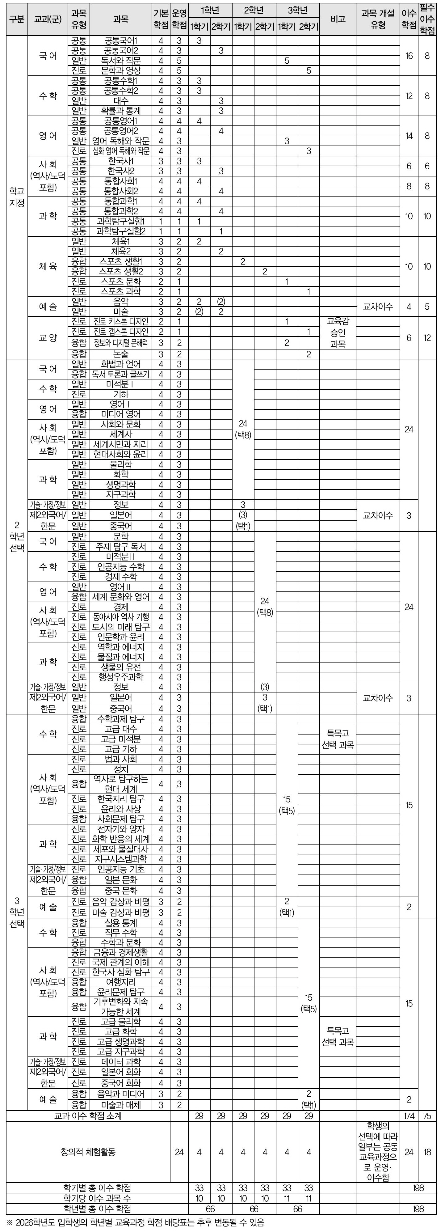 ●세화여자고등학교 교육과정 학점 배당표(안) _ 2026학년도 입학생 기준
