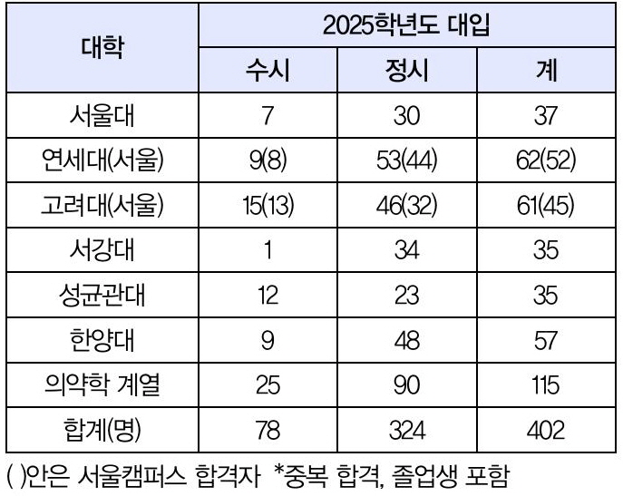 단대부고의 2025학년도 대입 성과(중복 합격, 졸업생 포함)는 매우 탁월하다. 서울 지역 6개 대학과 의약·학 계열의 수시 합격 인원은 78명, 정시 합격 인원은 324명으로 전년도 대비 93명이 증가했다. 서울대 의대 합격자 최대 4명(수시 2명, 정시 2명)으로 고교 순위 1위이다. 그중 서강대의 정시 합격자 수 증가가 두드러진다. 재학생, N수생 모두 지원자와 합격자가 늘어났다. 융합 및 자유전공 계열 합격자가 40여 명으로, 그 중 서강대학교 자유전공학부가 15명이었다.
