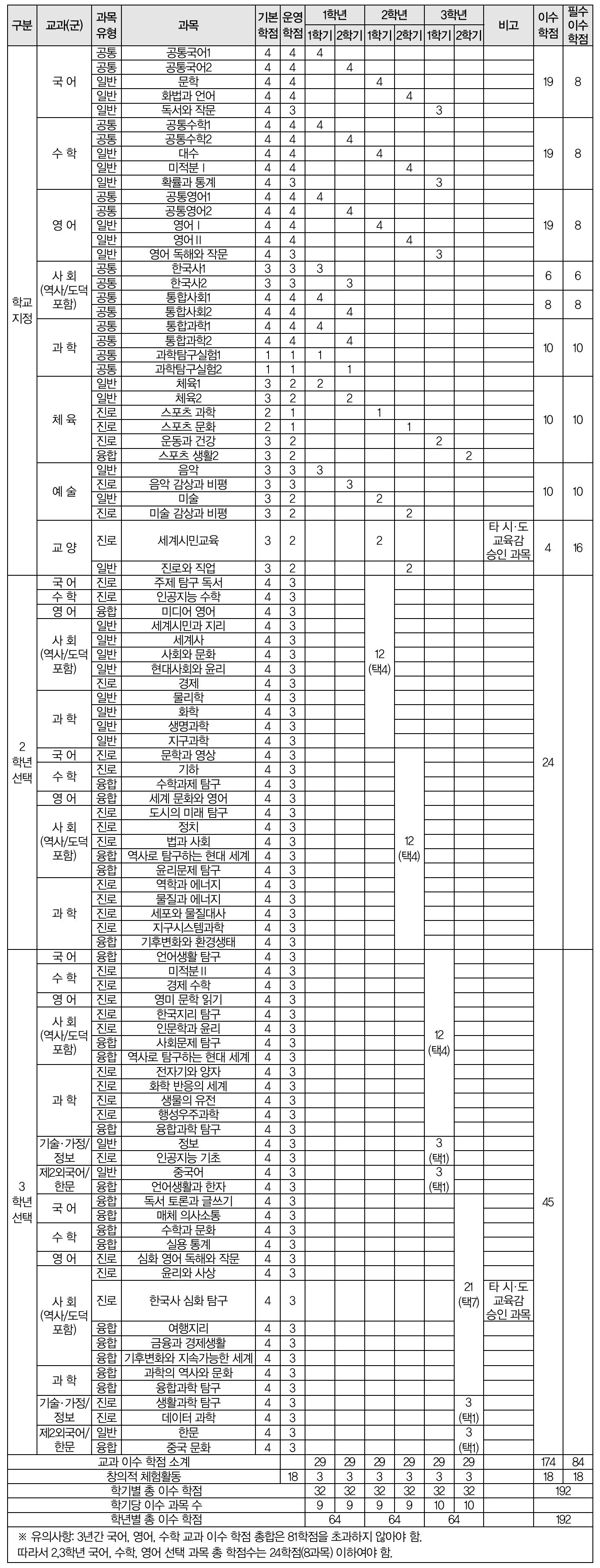 아울러 공통 과목과 일반 선택 과목, 주요 진로 선택 과목의 적절한 주당 수업 시수와 수업의 연속성을 확보해 학생들이 실제로 과목의 목표를 달성할 수 있도록 구성한 것도 눈에 띈다.