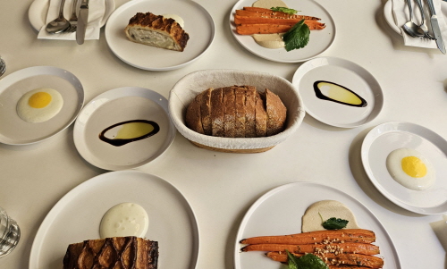 매봉역 4번 출구 인근, 양재천 카페거리에는 독특한 매력을 지닌 맛집들이 즐비해 있다. 그중에서도 이찬오 셰프가 운영하는 프렌치 레스토랑 ‘마누테라스’가 눈길을 끈다. 이곳에서는 양재천의 아름다운 가을 정취를 느끼며 다양한 코스 요리를 즐길 수 있다. 합리적인 가격의 런치 세트(33,000원)를 주문해 봤다. 애피타이저 2가지, 메인 메뉴, 디저트, 커피(혹은 티) 등이 차례대로 나온다.