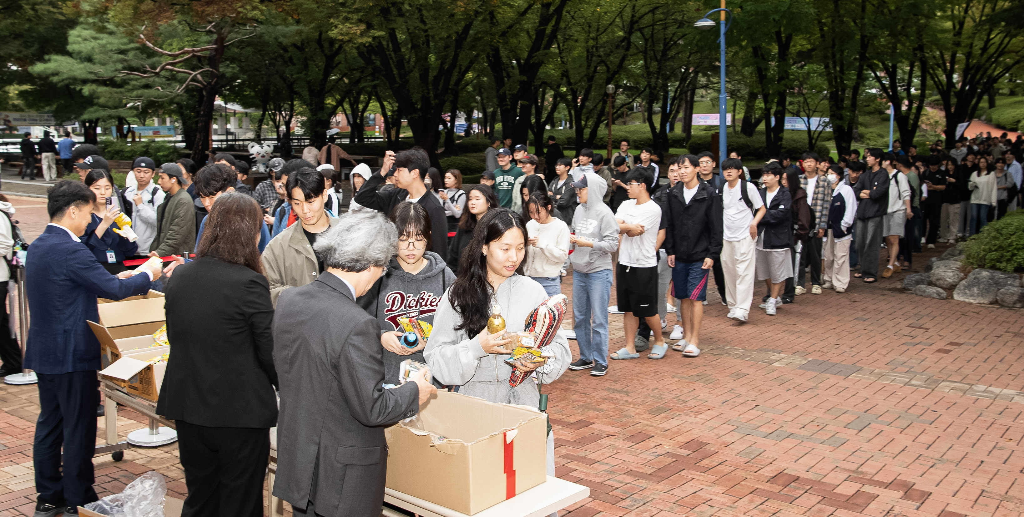 이날 도서관은 학생들이 든든하게 힘을 낼 수 있도록 샌드위치 600개와 청보리차, 커피 등 음료, 피로 해소용 초콜릿과 젤리를 정성껏 준비했으며, 박종백 부총장, 하덕식 교무처장, 박효진 학생복지취업처장, 송혜영 도서관장이 직접 학생들에게 간식을 전달했다.