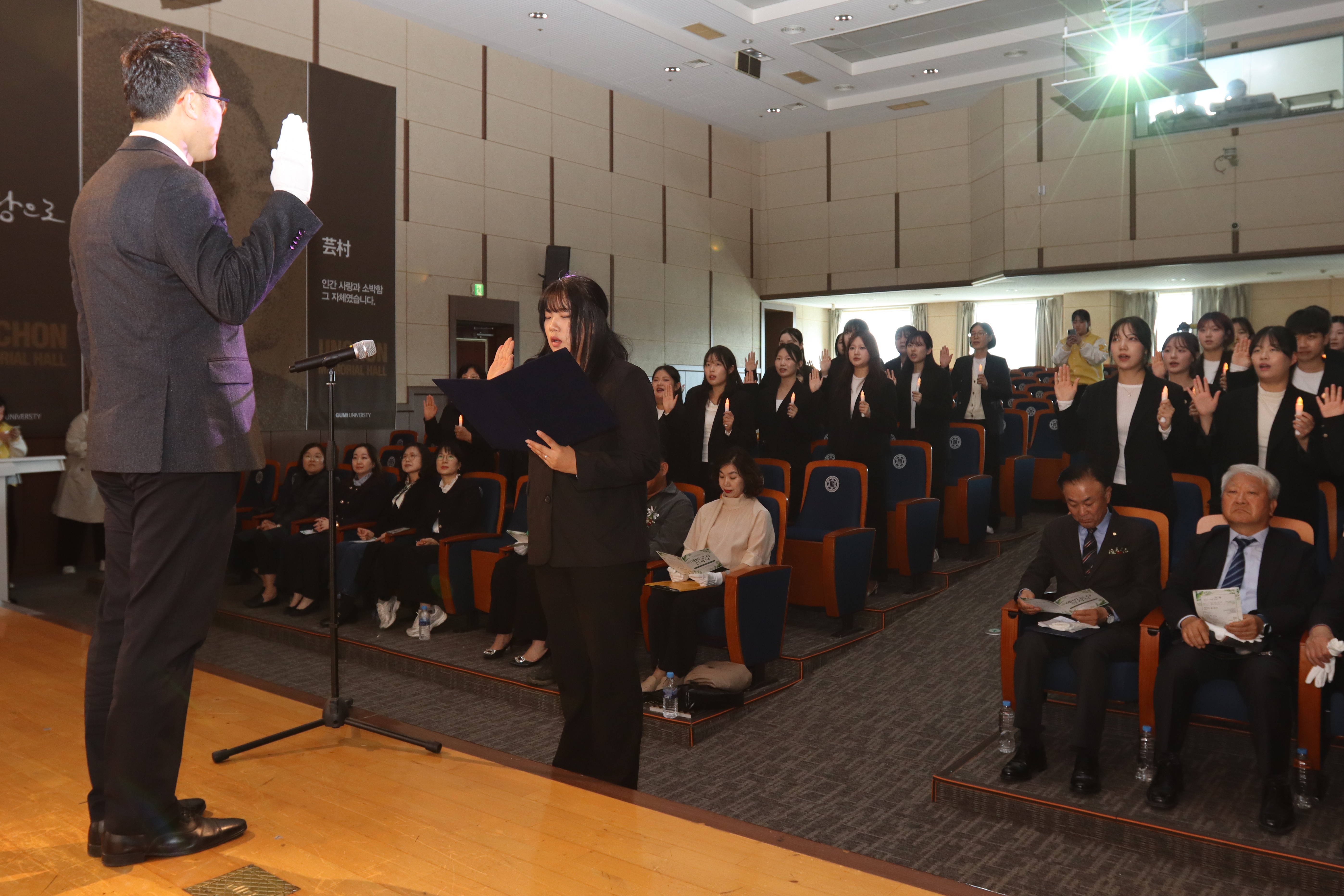 유치원 현장실습에 앞서 실시된 선서식은 예비교사로서의 자긍심을 다짐하고, 유아의 존엄성과 권리를 되새기는 의미의 선언문 낭독과 재학생 축하공연, 졸업생 응원 영상 등으로 진행됐다.