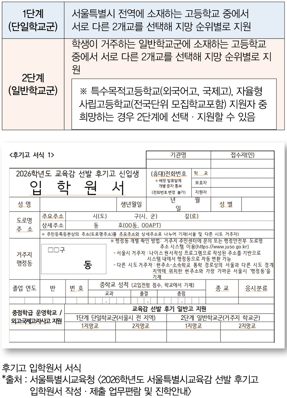 참고자료 서울특별시교육청 <2026학년도 서울특별시교육감 선발 후기고 입학원서 작성·제출 업무편람 및 진학안내>,