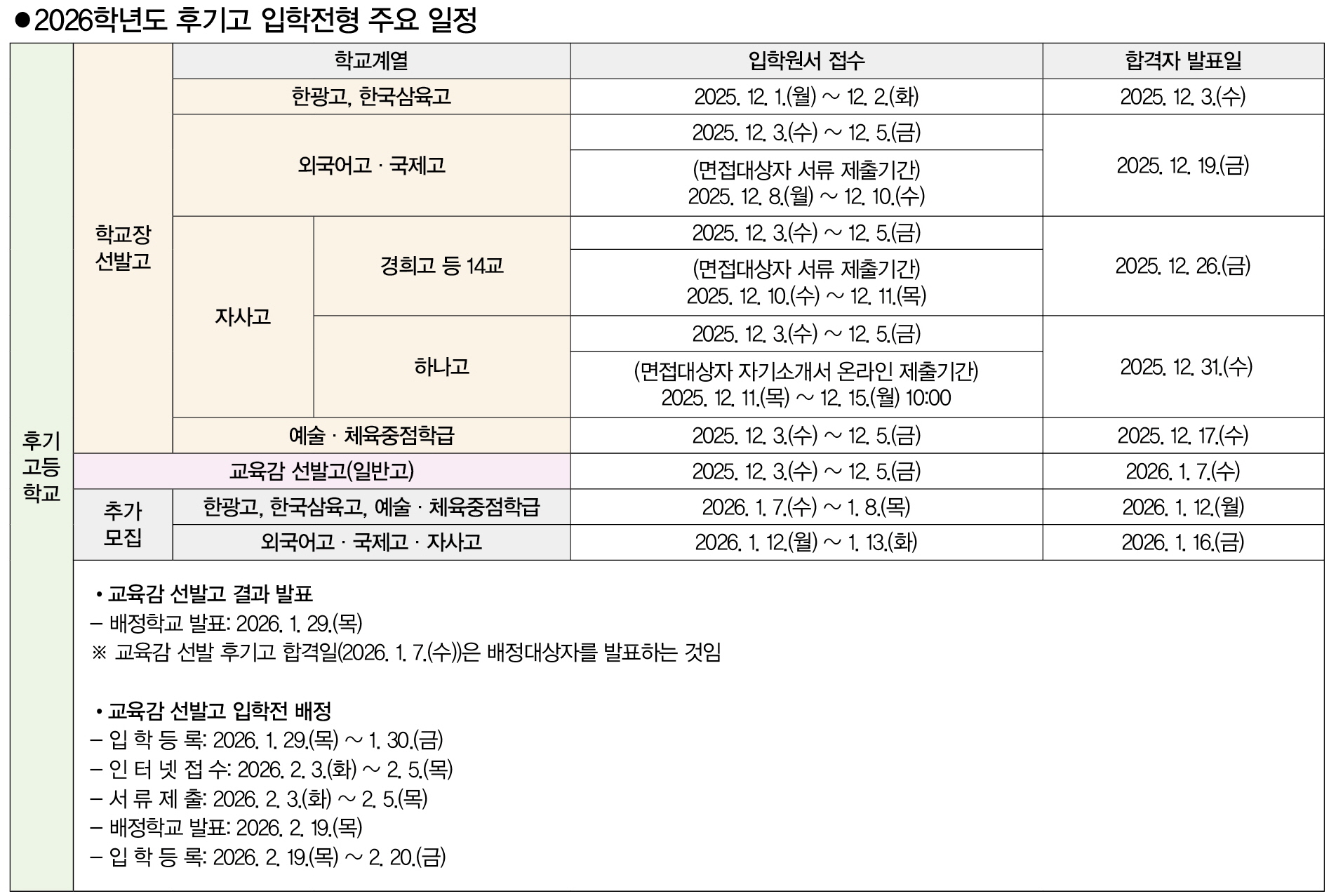 2026학년도 서울특별시교육감 선발 후기고등학교 원서 접수가 2025년 12월 3일부터 시작된다. 교육감 선발 후기고 입학전형 중 지원, 선발, 배정방법과 전형 일정을 요약해보고, 학생과 학부모가 가장 많이 질문하는 궁금증을 모아봤다.