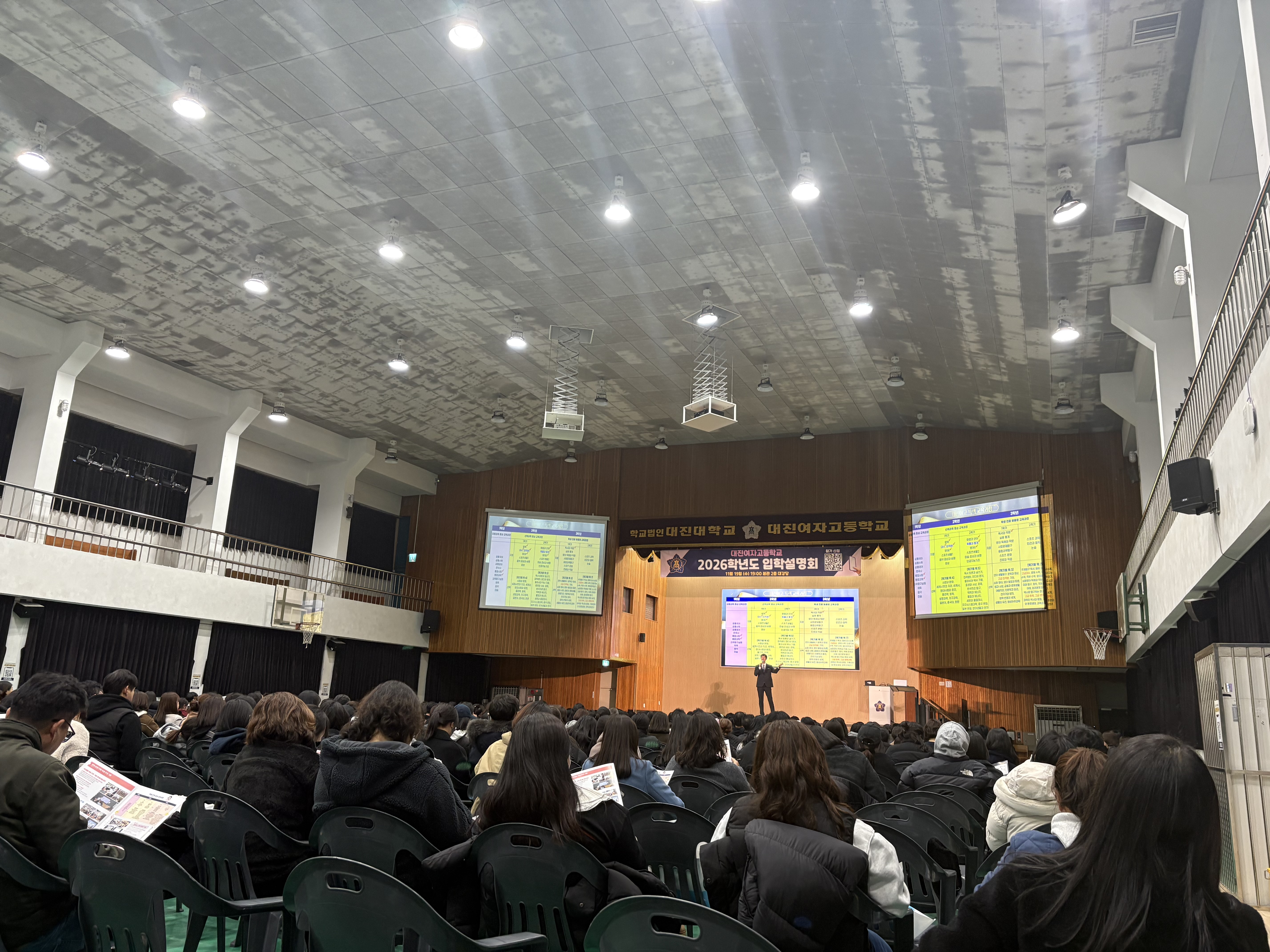 대진여자고등학교(이하 대진여고)는 지난 11월 19일(수) 오후 7시 대강당에서 2026학년 신입생을 위한 입학설명회를 개최했다. 이번 설명회는 김정남 교장의 인사말을 시작으로 진로진학부, 통합교과부, 질의응답 순으로 진행됐다. 지역에서 독보적인 입시 명문 여고로 인정받고 있는 대진여고 설명회에는 학부모와 학생들이 강당을 가득 채울 정도로 관심이 쏟아졌다.