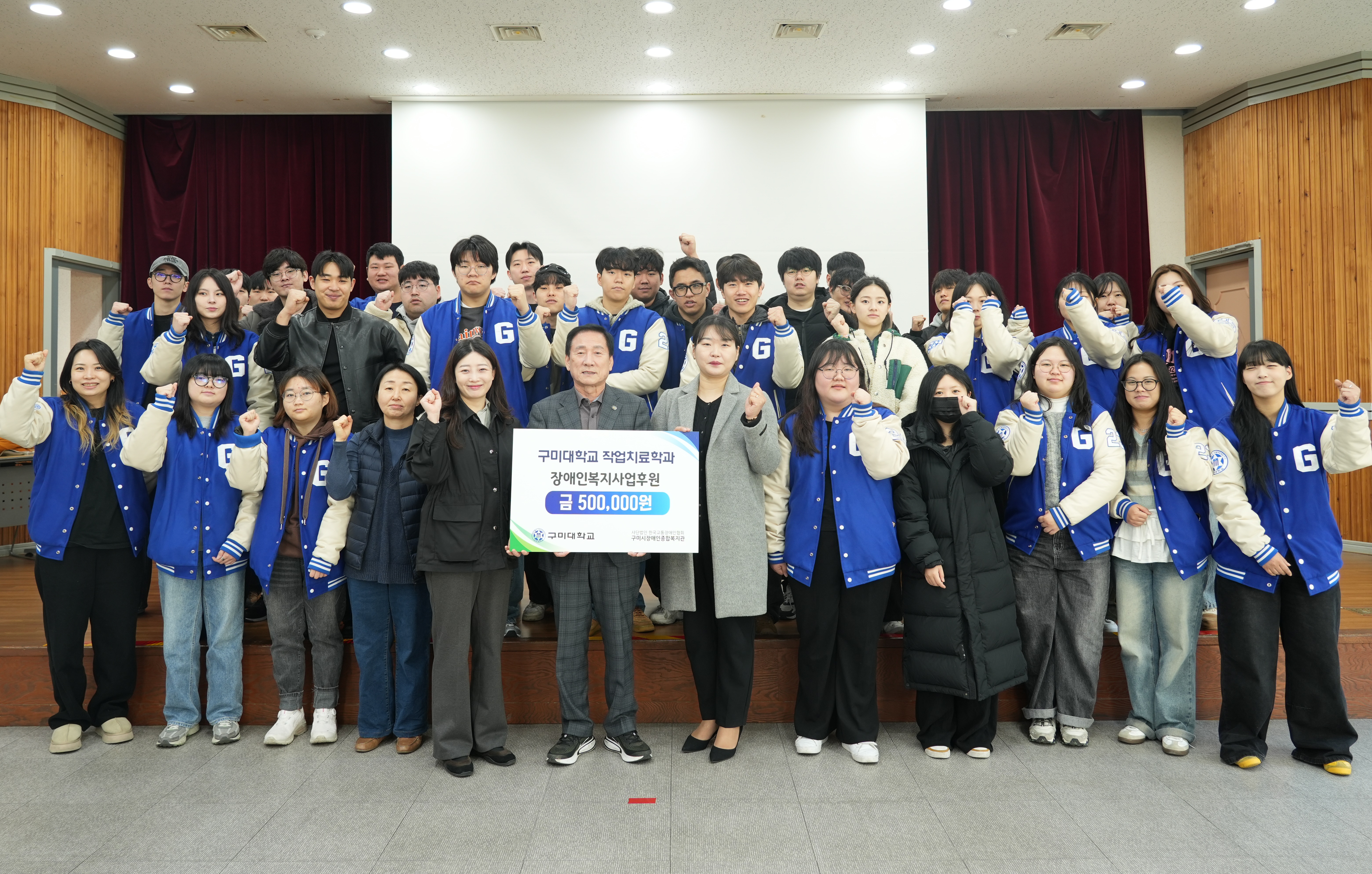 경북 구미대학교(총장 이승환) 작업치료과가 학과 행사에서 마련한 기부금을 구미시장애인종합복지관에 전달해 주위를 훈훈하게 하고 있다.