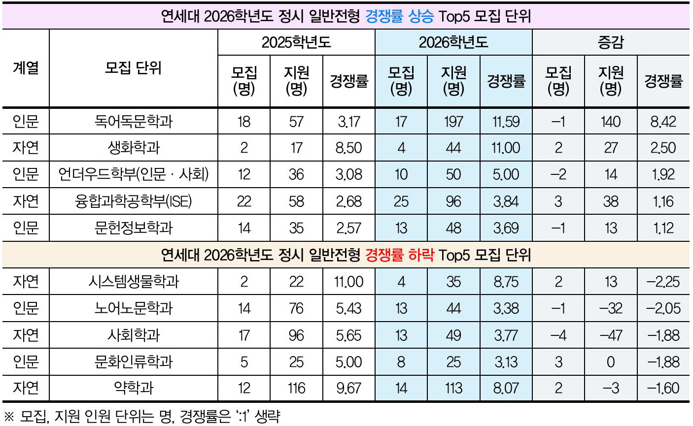 2026학년도 정시모집에서 연세대 전체 모집 인원은 14명 증가했고, 지원 인원은 186명 증가해 2025학년도와 유사한 경쟁률을 보였다. 자연계의 경우 모집 인원은 79명 증가했으나 지원 인원은 192명 증가에 그쳐 자연 계열 전체 경쟁률은 소폭 하락했다. 인문계열은 모집 인원은 62명 감소했으나 지원 인원 감소는 19명으로 경쟁률이 소폭 상승했다. 2026학년도에 신규 모집하는 ‘진리자유학부’와 ‘모빌리티시스템전공’에 총 683명이 지원했는데, ‘모빌리티시스템전공’이 10명 모집에 62명이 지원헤 6.2:1의 높은 경쟁률을 보였다.