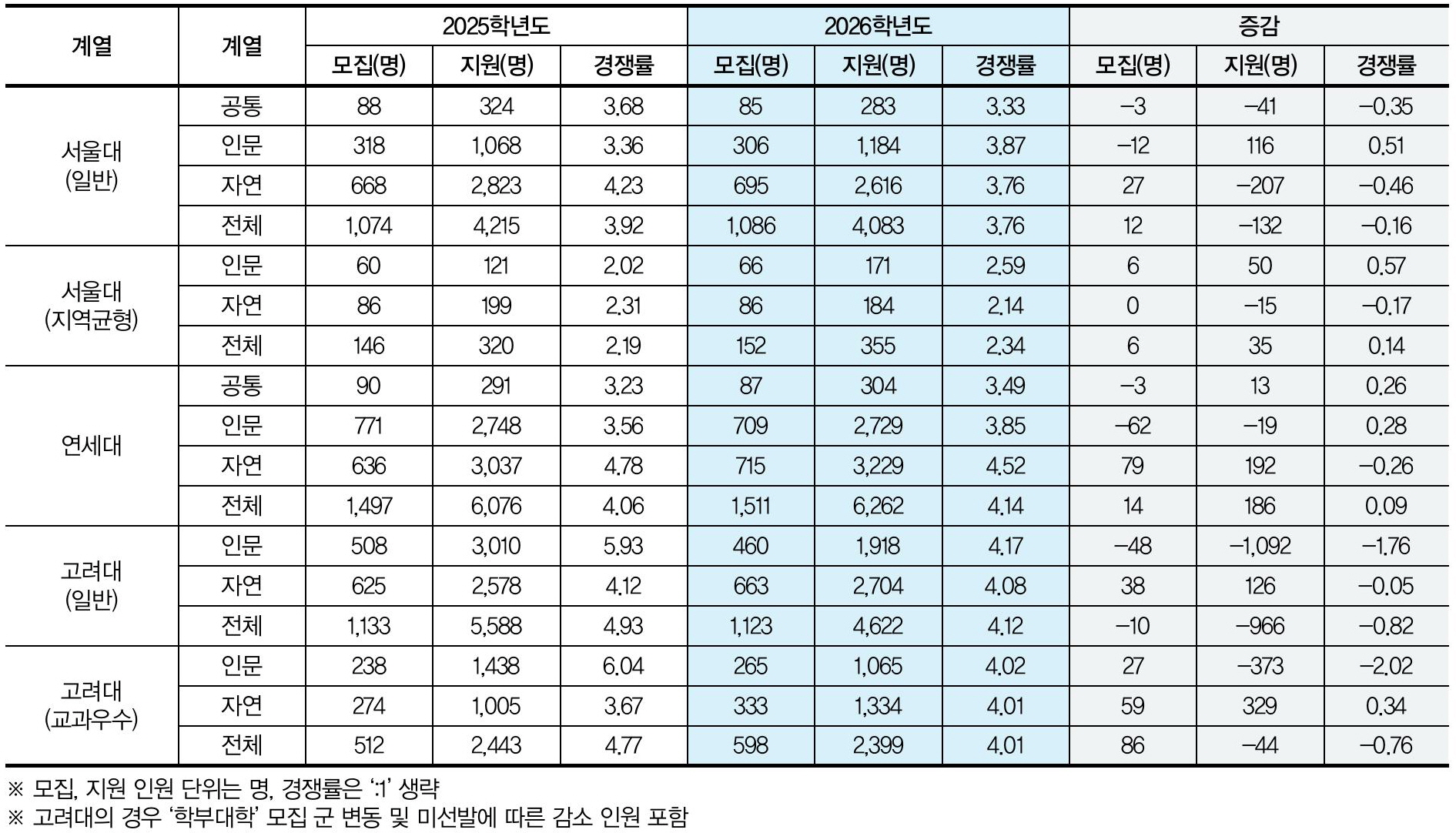 [표2] 서·연·고 2026학년도 정시 모집 경쟁률 현황(vs 2025)