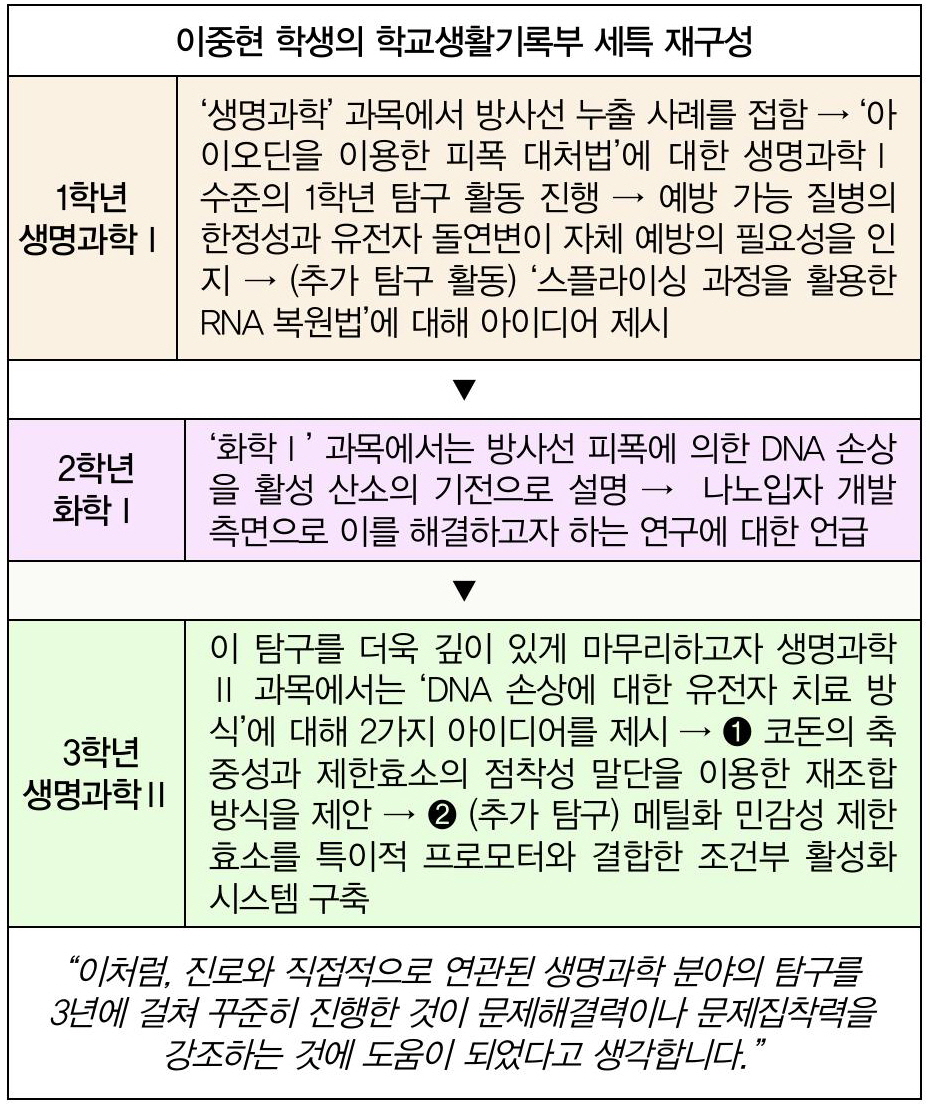 이중현 학생의 학교생활기록부 세부능력 및 특기사항(이하 세특)에는 학년별로 단계적 심화 탐구 활동이 돋보인다.