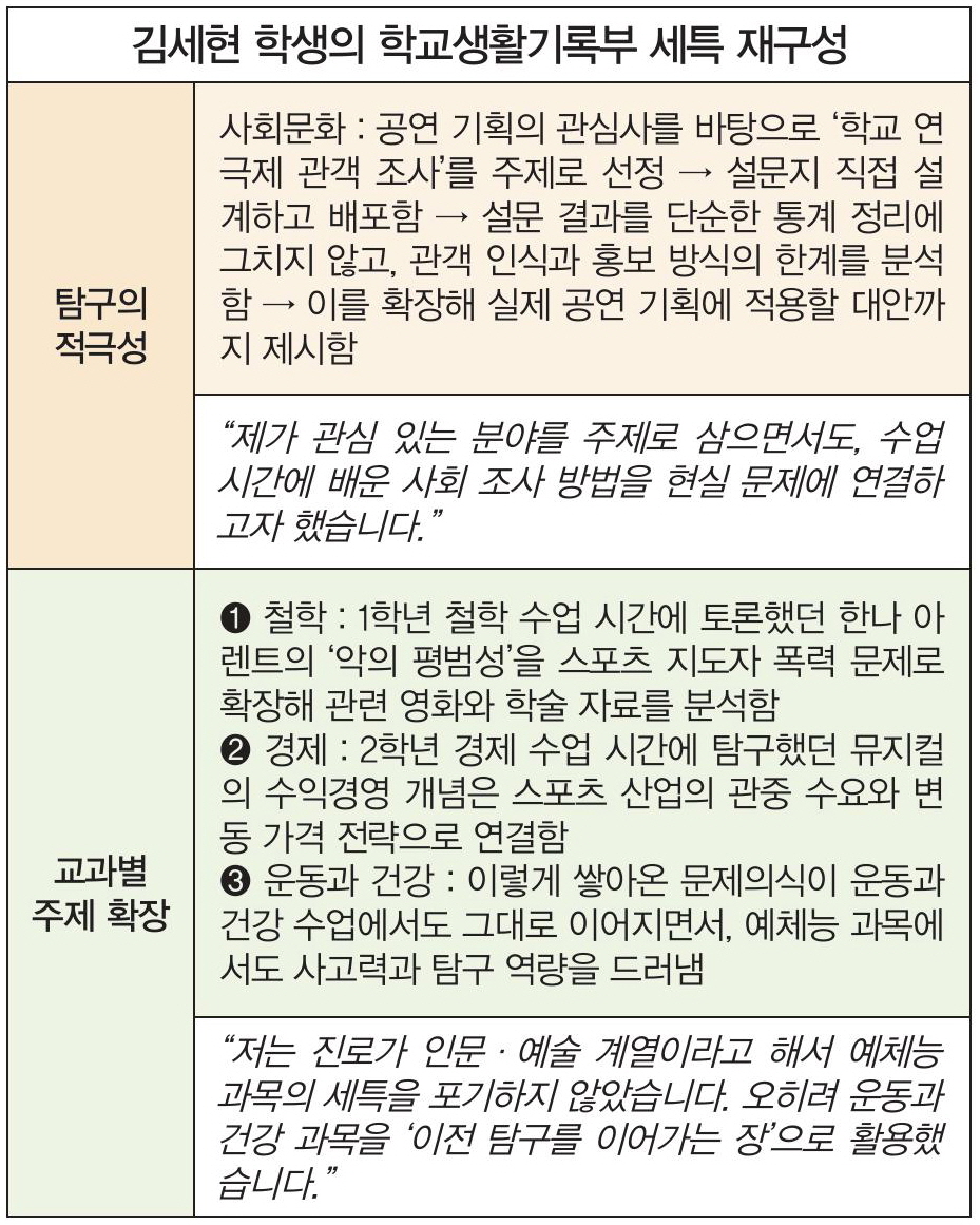 김세현 학생의 학교생활기록부 세부능력 및 특기사항(이하 세특)에는 ‘탐구의 적극성’이 돋보인다.