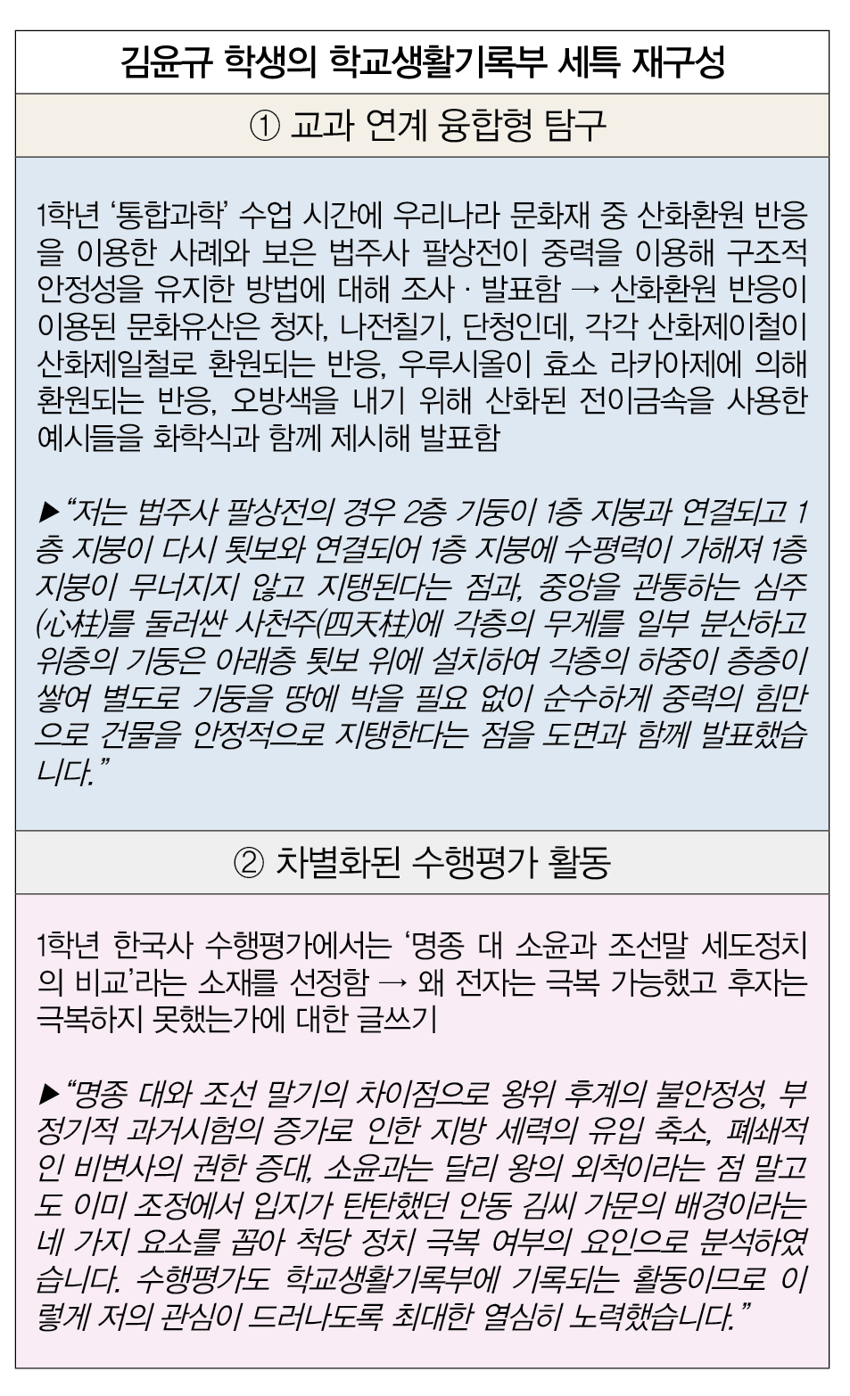 김윤규 학생의 학교생활기록부 세부능력 및 특기사항(이하 세특)에는 역사에 대한 관심을 자기만의 차별화된 시선으로 담아내면서도 깊이 있게 탐구했던 점이 돋보인다.