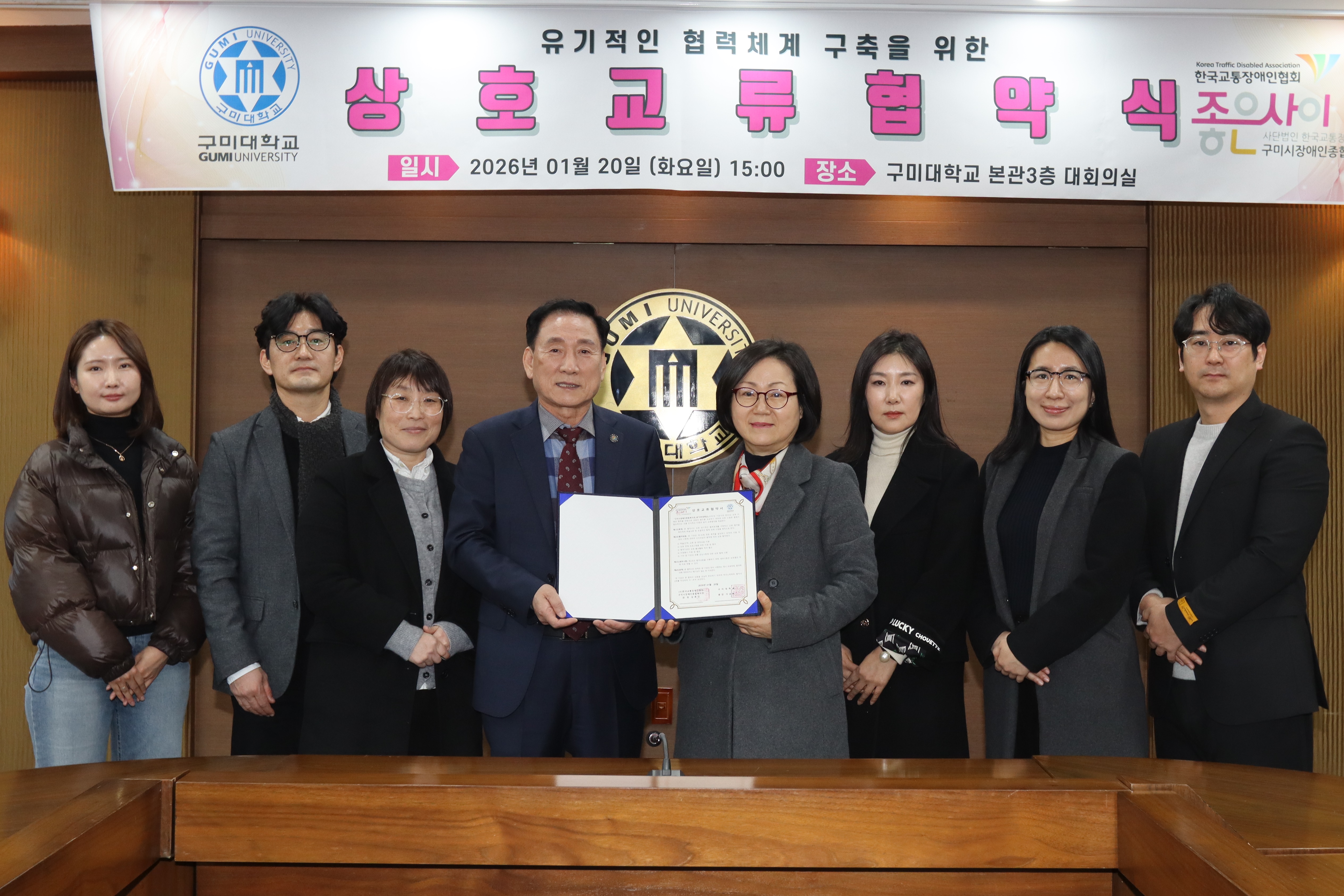 20일 구미대 본관 대회의실에서 열린 협약식에는 김금숙 의료뷰티디자인학부 교수, 김휴진 구미시장애인종합복지관장 등 양측 관계자들이 참석했다.