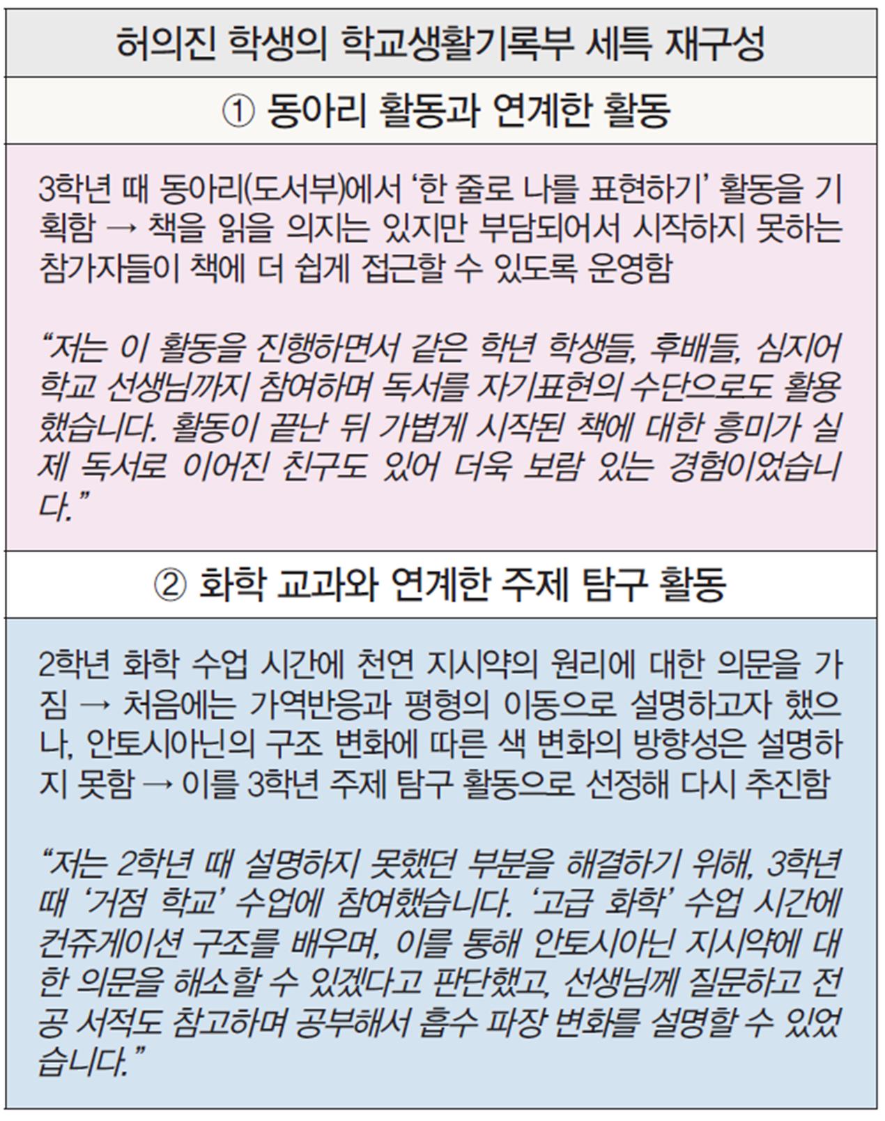 허의진 학생의 학교생활기록부 세부능력 및 특기사항(이하 세특)에는 일상 혹은 각 수업 내용에 대한 의문에서 출발한 탐구 주제를 선정해 문제를 해결했던 탐구 역량이 돋보인다.