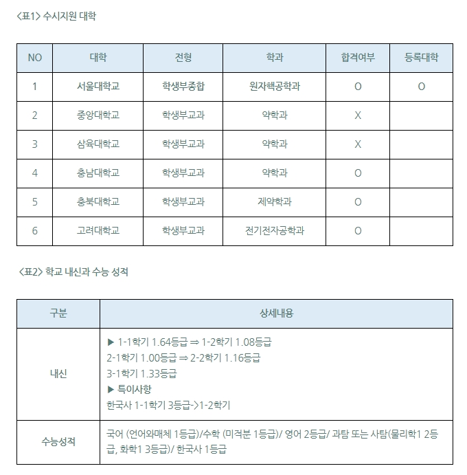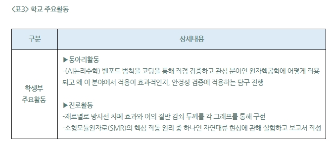 “늦은 결정이었지만, 고3 때가 되어서야 생기부 내용을 원자핵공학으로 채울 수 있었습니다. 그 과정에는 원자력발전소의 안정성을 검증한 동아리 활동, 소형모듈원자로의 자동원리 중 자연대류 현상을 실험하고 보고서를 작성한 활동이 신뢰를 준 것 같습니다.”