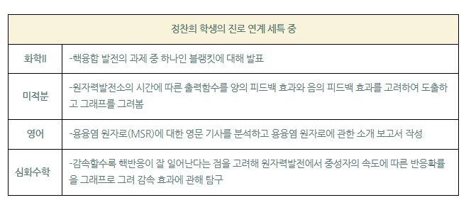 정찬희 학생은 고3 때 생기부에 특수성이 강한 원자핵공학과 관련한 탐구활동으로 채운 것이 대학합격에 주효했다고 전한다. “교과 세특의 경우 원자핵공학을 희망 진로로 삼았기 때문에 관련된 분야에 관한 지속적인 관심을 드러내는 것이 중요하다고 생각했습니다. 특히 미적분 수업에서 직접 원자력발전소와 시간에 따른 출력함수라는 수학적 원리를 연결해서 그래프로 표현하면서 굉장히 보람을 느꼈습니다.”