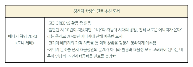 정찬희 학생의 희망 진로는 ‘전자전기공학’이었다. 하지만 목표가 명확하지 않았고 흥미도 지속적이지 않았다. 그러나 고3때 참여한 GREENS 활동을 통해 최근 기후 위기 등 환경 문제에 관심을 기울이며, 최신 에너지 변화를 탐구하고 현대 필수적인 에너지 문제를 꼭 해결하고 싶어졌다. 단순히 생산적 효율성만을 강조하던 화학에너지가 아닌 환경을 고려한 다양한 에너지원을 찾아보며 ‘환경과 효율성’ 모두를 반영한 ‘원자력 및 핵융합 발전’에 큰 관심을 가지게 되었다. 이런 과정을 거쳐 ‘원자핵공학’이라는 새로운 학과로 진로를 전환했다.