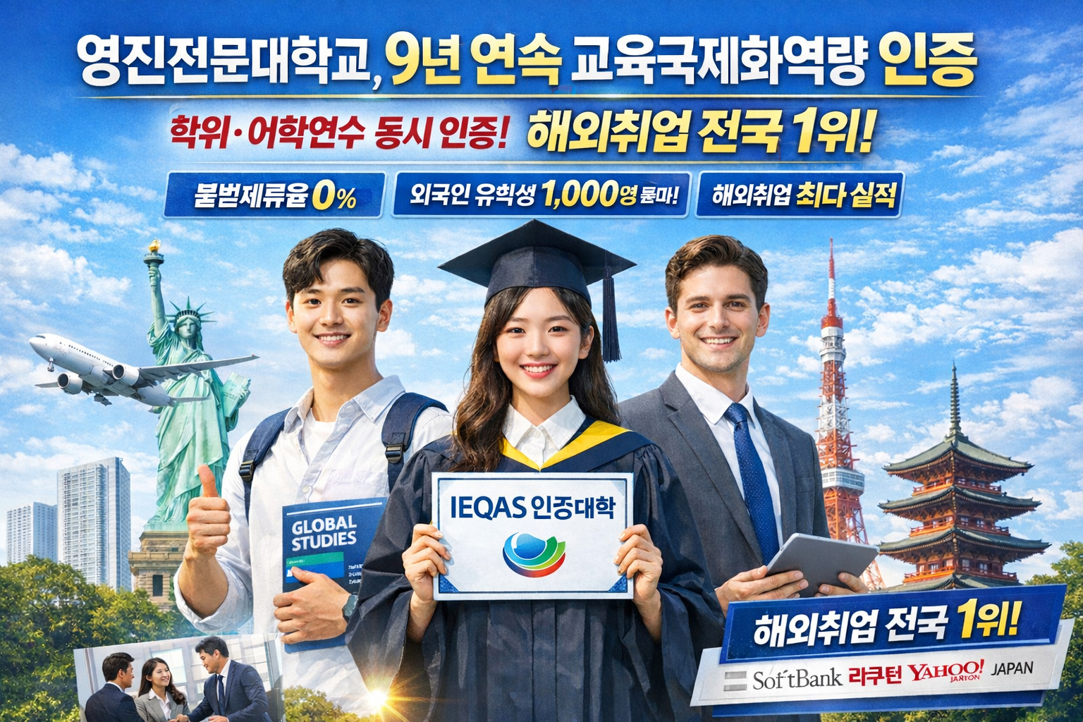 최근 10여 년간(2016~2026년 교육부 정보공시 기준) 해외취업 인원은 총 1,043명으로, 전국 2·4년제 대학을 통틀어 최다 실적을 달성했다. 특히 소프트뱅크, 라쿠텐, 야후재팬 등 글로벌 기업에 다수의 졸업생을 진출시키며 국제 경쟁력을 갖춘 직업교육 모델로 평가받고 있다.