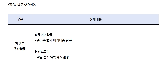 “3학년 때 진행했던 화학 2, 생명과학 2, 그리고 진로활동 까지 함께 하나의 대주제인 ‘약’을 바탕으로 탐구를 진행했습니다. 화학은 헨더슨-하셀발크식, 생명과학 2는 평형 상수와 미카엘리스-멘텐식 등 핵심 교과 개념과 수업 과정에서 생긴 궁금증을 풀기 위해 탐구를 진행했습니다.”