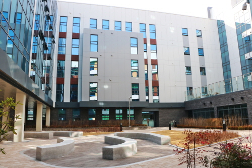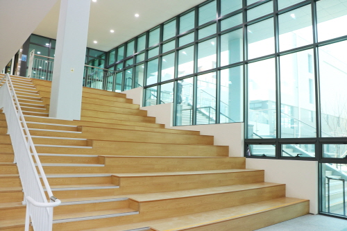 중앙정원은 학교 건물이 병풍처럼 둘러 있어 어디서든 정원의 운치를 느낄 수 있다. 건축 미학이 돋보이는 강당은 학교 건물과 연결된 브리지 구조로 이동 편의성을 높였다.
