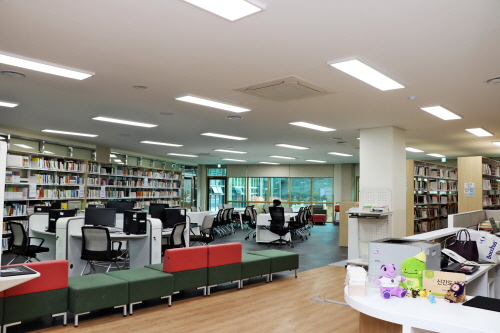 쉬는 시간과 점심시간에도 학생들이 자주 찾는 도서관. 전면 통창으로 개방감을 주어 학교 정원의 운치를 느낄 수 있다.