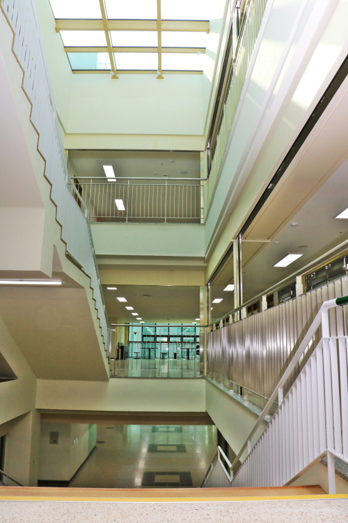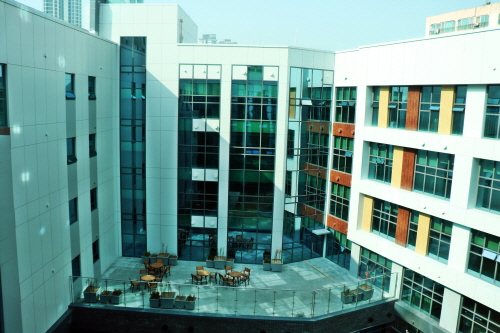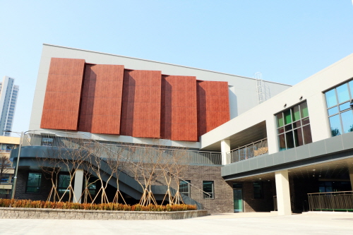 중앙정원은 학교 건물이 병풍처럼 둘러 있어 어디서든 정원의 운치를 느낄 수 있다. 건축 미학이 돋보이는 강당은 학교 건물과 연결된 브리지 구조로 이동 편의성을 높였다.