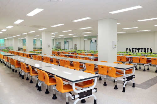 학생들에게 사랑받은 스마트 자전거실과 급식실. 청담고에는 별도의 체력단련실 외에도 스마트 자전거실이 마련되어 있어 체력 단련과 건강을 도모할 수 있다. 급식실은 따뜻한 색감의 의자가 아늑함을 더해, 청결하면서도 아기자기한 느낌을 자아낸다.