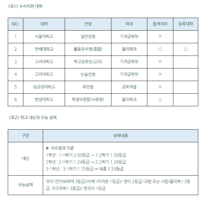 이런 노력은 ‘물리학과’ 진학으로 이어졌고, 주변의 조언에 따라 현실적 접근이 쉬운 공학계열도 지원했다. 결과는 원하는 ‘물리학과’ 합격증으로 마무리되었다.
