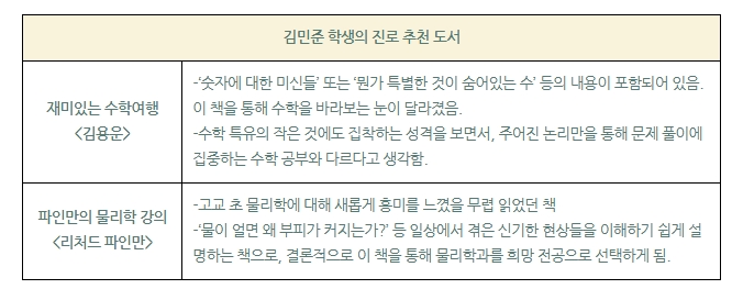 김민준 학생은 중학교 때부터 자발적으로 수학학원을 찾을 정도로 수학 문제에 관심이 많았고, 물리학에 대한 유튜브를 시청하며 관심이 이과에 집중되었다.