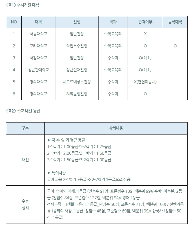 중학교를 전교 2등으로 졸업하고, 고교 진학 후부터 본격적으로 대입에 관해 고민하고, 교사가 되기 위해 ‘교육학과’에 진학하자는 마음으로 공부하고, 학생부 내용도 채웠다.