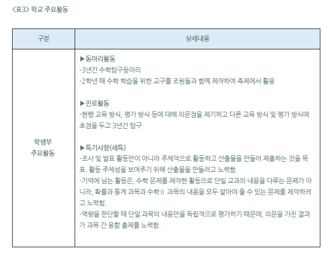 이후 3학년 때는 입시 준비로 인해 ‘수학 탐구동아리’ 활동 진행이 어려웠지만, 관련한 다양한 탐구보고서를 작성하여 학생부를 채웠다. “‘현행 가르치는 수학 개념의 학습 순서가 적절한가?’ 등의 주제를 선정해 나만의 교육 가치관을 보여주기 위해서 노력했던 것 같습니다.”