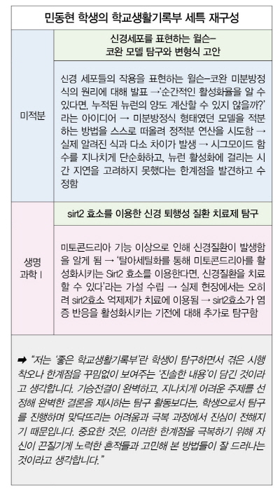 민동현 학생의 학교생활기록부 세부능력 및 특기사항(이하 세특)에는 탐구 과정에서의 시행착오와 한계점을 극복해 나가는 노력의 흔적이 매우 세밀하게 담겨있다. 입시에 유리한 세특을 목표로 했다면 절대 담길 수 없는, 학생다운 모습이면서도 진정성이 느껴진다.