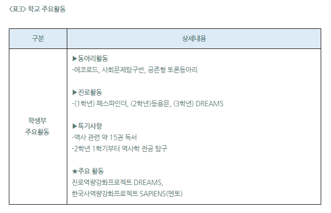 3학년 학생부는 탐구과정에서 적극성을 표현하기 위해 ‘박물관 답사와 자발적 토론 활동’에 참여했다. “역사학과 진학 준비를 시작한 2학년부터 보고서에서 ‘비판과 해결방안’을 도출하는 데 공을 들였습니다. 특히 고3 생기부에 전문성이 보이도록 학술적인 이론이나 개념에 근거하여 보고서 제목을 짜거나, 탐구의 중요 논제로 해당 이론과 개념을 설정하는 것이 좋습니다.”