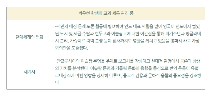 박우현 학생은 세특을 무리하게 전공과 엮으려 하지 않고, 모든 과목의 세특을 골고루 챙기기보다는 전공 관련 과목 세특이나 진로, 자율 부분을 중점적으로 깊이 있게 다루려고 노력했다. “과목에 한정해서 기록했고, 가능한 경우에만 내 전공인 역사학 관련 활동을 중점적으로 연관 짓고자 했습니다. 세특을 기록할 때는 1순위인 해당 교과목의 내용에 충실한 내용을 적는 것이 더 현명하다고 생각합니다.”